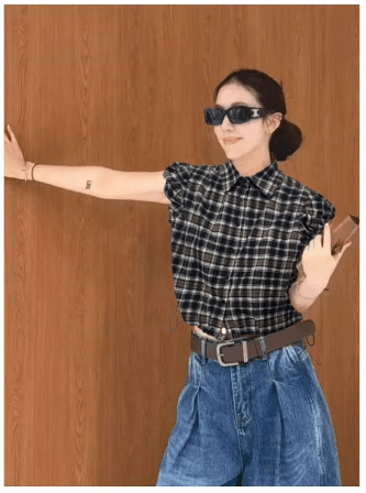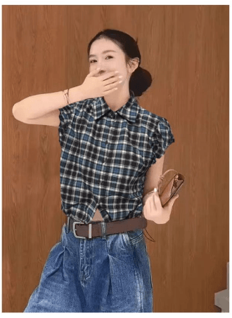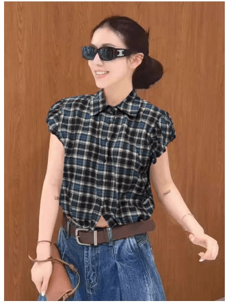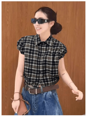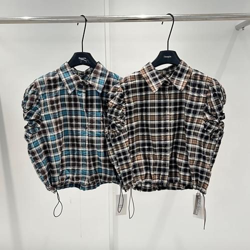 包袖格子縮腰襯衫